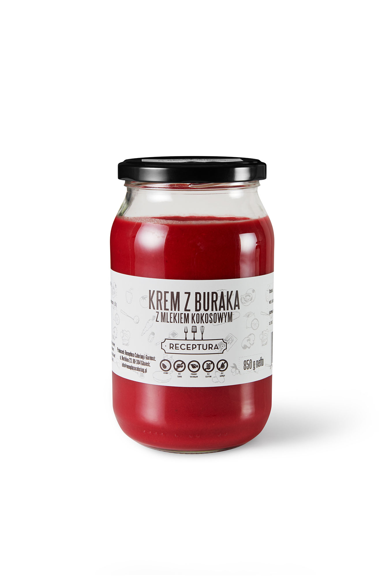 Składniki: woda, burak czerwony, cebula, marchew, mleko kokosowe(ekstakt kokosowy 85%, woda, substancja stabilizująca), koncentrat burak(zagęszczony sok z buraków ćwikłowych 60%, woda, cukier, sól, regulator kwasowości: kwas cytrynowy, pieprz czarny, czosnek, majeranek ,koper, marchew, pietruszka), olej rzepakowy, sól, pieprz.